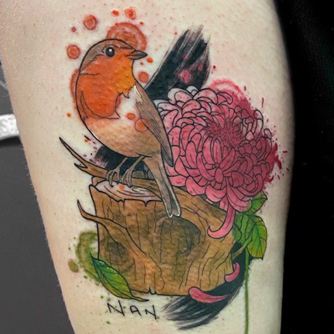 Tattoo, tat, ink, body art, Colchester, essex, best rated tattoo, top artist, best artist, tattoo Colchester, Colchester tattoo, essex tattoo, tattoo essex, recommended tattoo studio, tattoo studio, cheap tattoo, good tattoo, tattoo art, ink, inked, reds tattoo, reds tattoo parlour, reds, reds tattoo studio, high street studio, anna kowacka, female tattoo artist, female artist, tattooartist, tattooed, watercolour, watercolor, watercolour tattoo, paint style, paint, paint style tattoo, splatter tattoo, watercolour splash, art, art style tattoo, arty, sketchy tattoo, illustrative tattoo, illustration tattoo, sketch tattoo, thigh, thigh tattoo, leg, leg tattoo, memorial, memorial tattoo, nan, nan tattoo, robin, robin tattoo, bird, bird tattoo, flower, flower tattoo, chrysanthemum, chrysanthemum tattoo, leaf, leaf tattoo, animal, animal tattoo